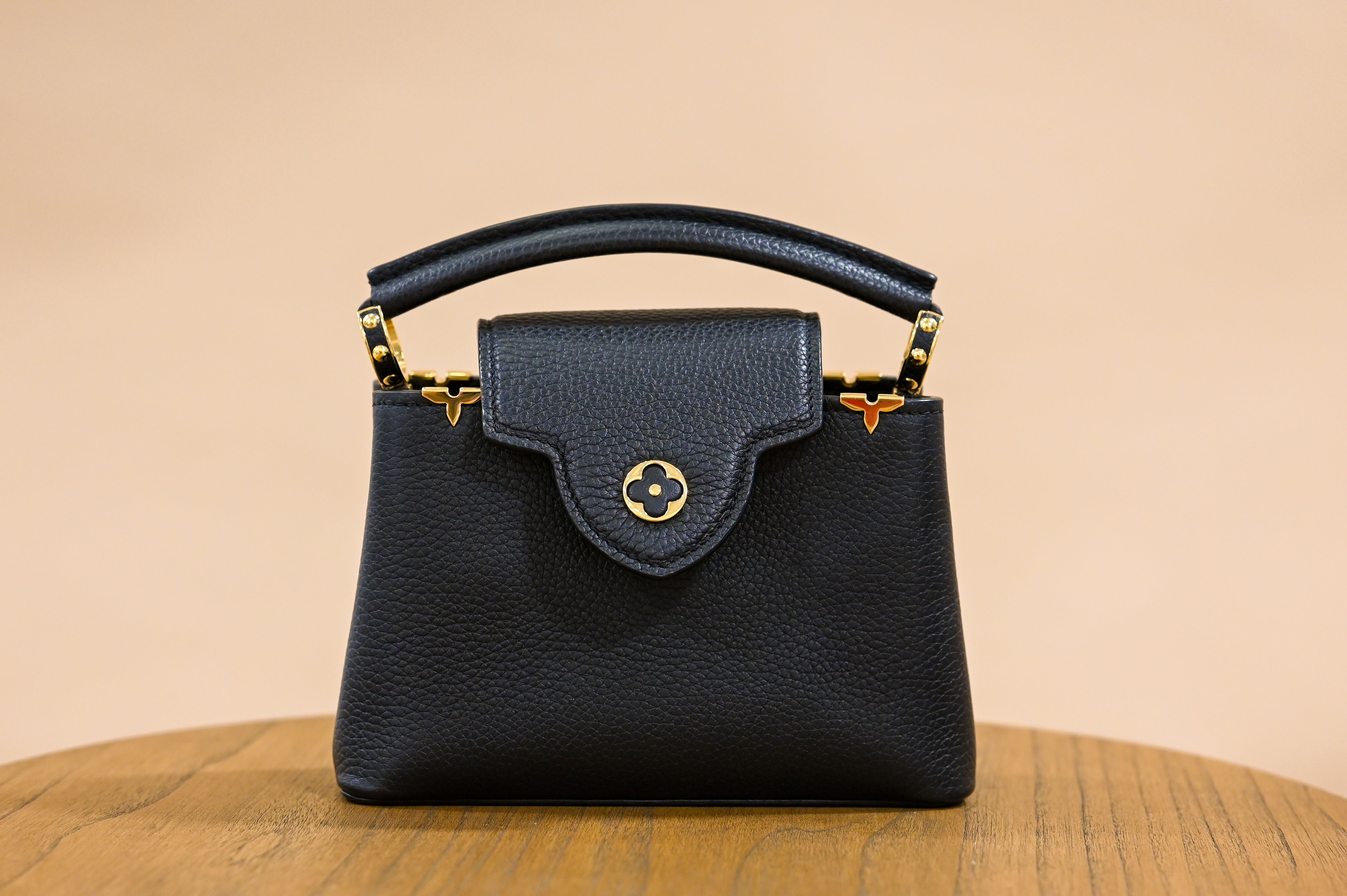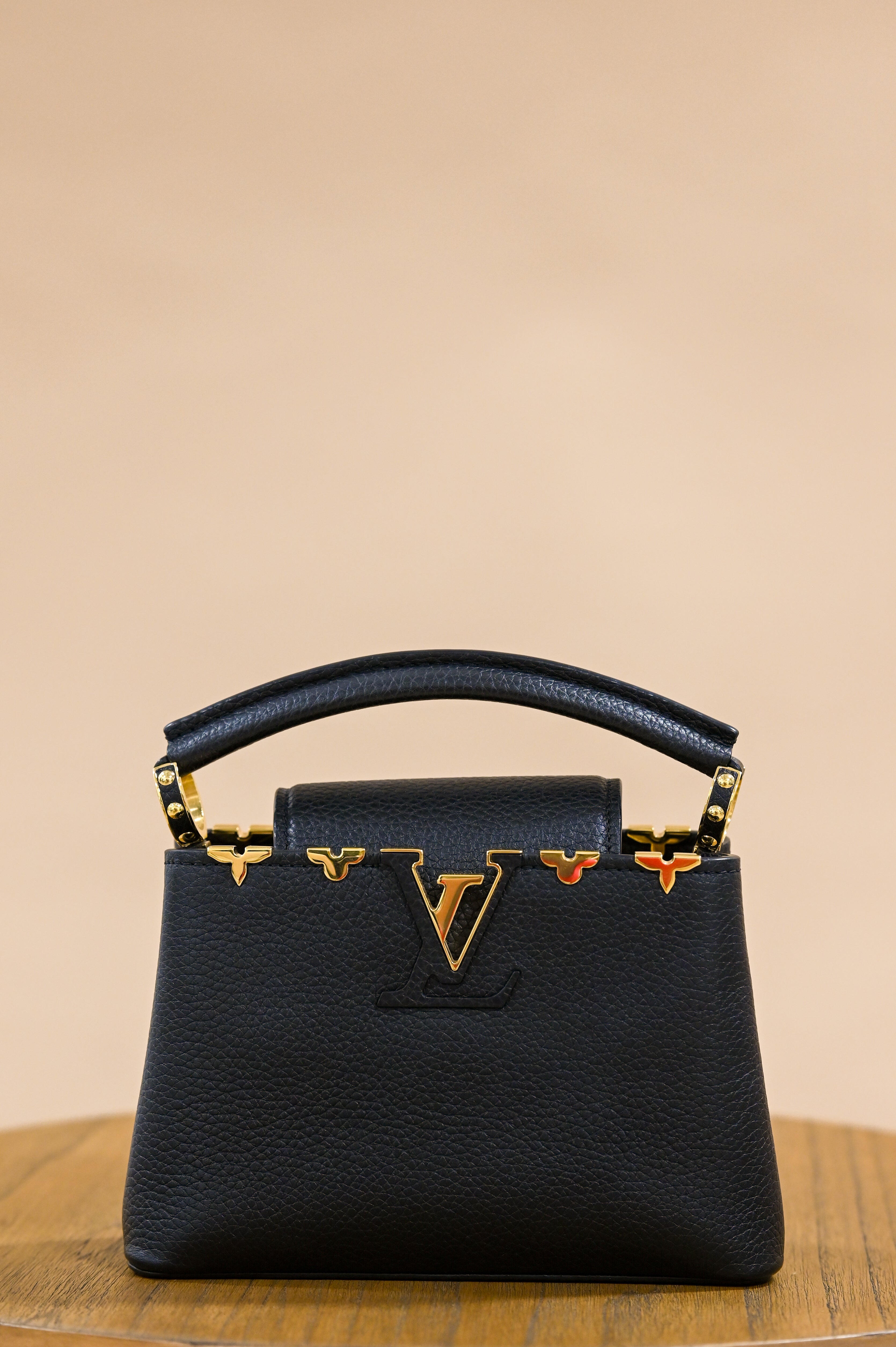 This Capucines Mini is fashioned from black Taurillon leather this structured top-handle silhouette is adorned with a “crown” of gold-tone Monogram Flowers, each one attached to the leather by hand. Its adorable size and ornamental blossoms bring refined femininity, while the fashionably wide removable strap and leather top handle offer versatile carry options. Offered well below retail, this piece combines exceptional craftsmanship, enduring desirability, and long-term value—an elegant luxury asset with undeniable prestige.